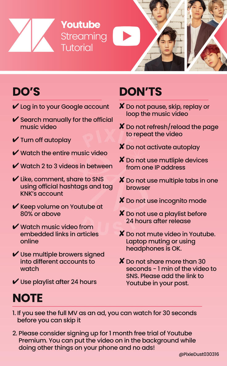 You can stream on pandora for free to help KNK on the billboard charts! You can also use Shazam to promote KNK on their 200 most popular songs chart. Shazam only counts one per hour so you can delete the app's data in your settings to have your shazam count more than once per hour.